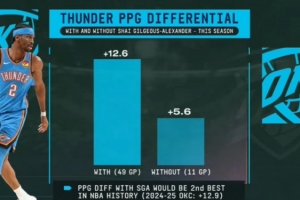 备注:本赛季有SGA时雷霆场均净胜分可排历史第二(第一为2024-25赛季雷霆:+12.9)