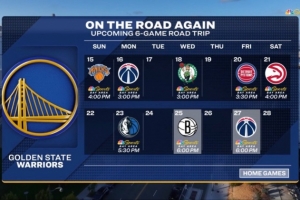 转播方晒出本场过后勇士的赛程,他们将开启六连客,对手分别为尼克斯、奇才、凯尔特人、活塞、老鹰和独行侠。