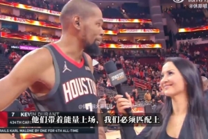 体育资讯3月14日讯 NBA常规赛,火箭107-105击败鹈鹕。赛后杜兰特接受记者瓦妮莎的场边采访。