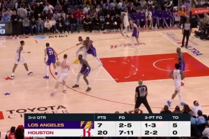 第三节前半节,火箭轰出20-7的攻击波,火箭投篮11中7(三分2中2),湖人则5中2(3中1)。湖人5失误,火箭0次。