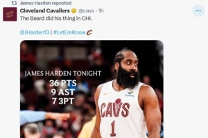 赛后骑士官方晒哈登数据海报,配文写道:大胡子在芝加哥大显身手。