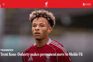 体育资讯2月28日讯 利物浦官方宣布,19岁边锋特伦特·科内·多尔蒂加盟莫尔德,据悉转会费75万欧元,这笔交易包含了回购条款以及二转分成条款。
