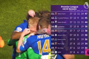 14/15赛季,蓝狐莱斯特城曾在那个赛季的英超长期垫底,他们很长一段时间都是降级的最大热门。但是自英超第31轮开始,他们末9轮豪取7胜1平1负拿下22分,完成保级(1负为第27轮补赛1-3切尔西)。从英超第20名冲到英超第14名,蓝狐实现逆天改命。后一个赛季的故事就家喻户晓了,刚刚实现保级奇迹的莱斯特城,上演了更著名的蓝狐奇迹,英超夺冠。