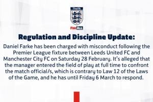 规章与纪律公告:“在2月28日周六利兹联与曼城的英超比赛结束后,法尔克因不当行为被正式指控。”