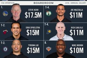本赛季教练薪资前十:科尔1750万美元领跑 斯波&泰伦·卢1500万紧随其后
